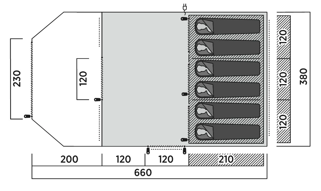 The Easy Camp Sola 6 is a spacious 3-zone family tent designed to provide comfort and practicality on any adventure. It boasts a large living area, a front wet zone for storing gear, and divided bedrooms for added privacy. These bedrooms can also be removed using toggles for ultimate flexibility. With the SleepTight inner tent, made with darker materials and featuring optimal ventilation, a good night’s sleep is guaranteed. To enhance airflow and usability, the tent also includes a full mesh side entrance, while the living area door is also mesh to keep bugs out. The front and side doors have two zip sliders each, allowing for customizable ventilation and entrance options. With its standing height in the living area and excellent air circulation throughout, the Sola 6 is the ultimate family camping companion.