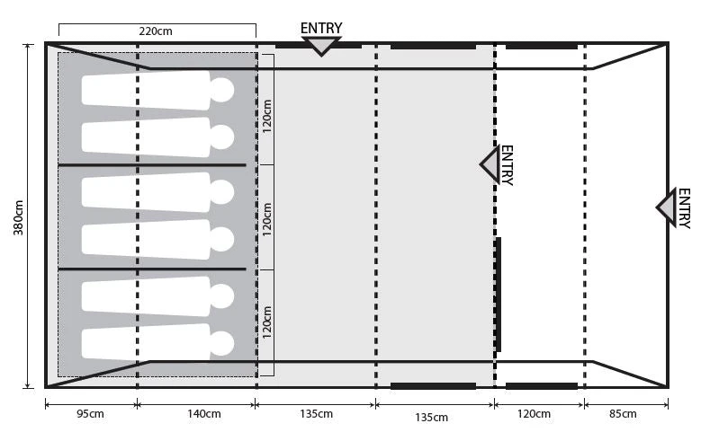 The internal design offers the perfect allocation of usable space for medium to large families. Starting with fully enclosed front porch, this provides an ideal area for relaxation, cooking, or dining whilst granting full protection against the elements. We then head into a generous commune area with the option to add a 2-berth inner tent for extra guests. Finally enjoying the darkened ‘Twilight’ fabric Six-person bedroom that can be split down to a 2-2-2 configuration using the toggle in dividers. The bedroom ventilation system, and ample mesh ventilation fly screen panels combined with crystal-clear window panels maintain an airy internal space and maximise airflow in warmer temperatures.