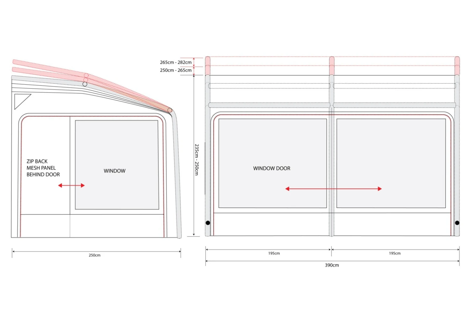 The all new 2025 Outdoor Revolution Sport Pro 390 premium air awning is packed with unbeatable functionality, usability and versatility to meet the needs of modern caravaners. Featuring a clean and understated design, it is built with a neutral but confident color scheme, designed to complement any caravan or motorhome. With a multi-functional zip in-zip out curtain system, luxurious polycotton curtains offer the option to be zipped out and removed, tied back in traditional style, rolled and tied up, or rolled and tied back either left or right. Constructed with our trusted 600HD awning fabric, it is built to withstand harsh weather conditions and maintain its strength and fade resistance. The Pro models also feature a multi-height adjustable roof, making it suitable for a wide range of van and motorhome heights, and come with standard 4mm and 6mm twin piping for easy rail connections. With all these great features, the Sport Pro awning range proves to be the most versatile choice