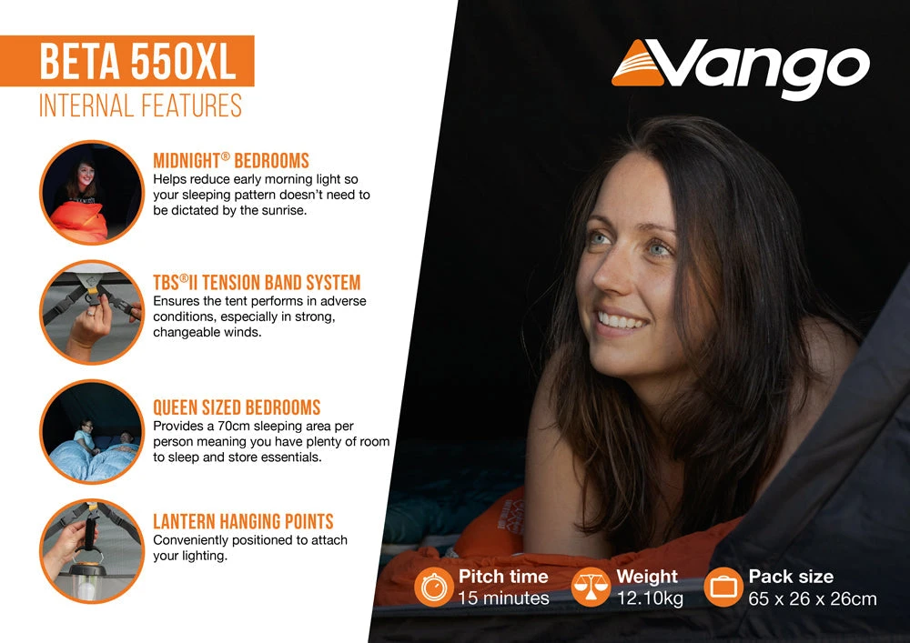 The Vango Beta 550XL tent is designed with the needs of 5 campers in mind. With 3 poles and a tunnel structure, it offers an ample sleeping area and a practical porch for storing camping essentials. Made with robust Sentinel Fabric that boasts a 4,000mm HH rating and ColourLok Eco technology, this tent is sure to retain its color for years to come. Its Dynamic Weave 100™ Fabric helps keep the overall weight and size of the tent low, without compromising on Vango’s signature quality and durability. Additionally, the midnight bedrooms promote a better night’s sleep, and the Easy-Pack Carry Bag makes packing up after your camping adventure a breeze. Whether for a slightly longer trip or a comfortable weekend getaway, the Beta 550XL is a top choice for campers looking for a spacious and reliable tent.